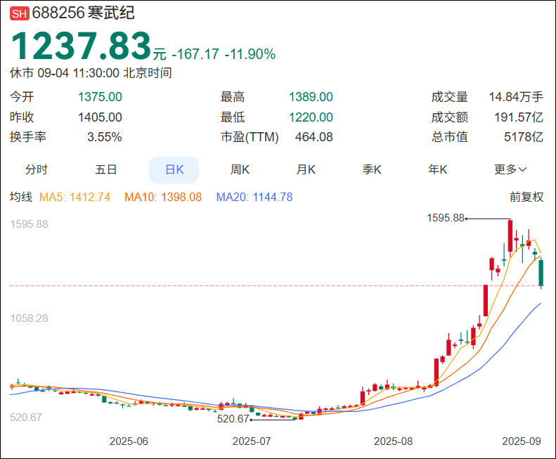 有杭州券商投资顾问称,“寒武纪作为当前A股市场的人气龙头,其涨跌肯定会对短期市场的走向产生一定的影响。特别是经过8月中旬以来的快速上涨,不少获利盘存在短期兑现浮盈的需求,这会对后端追高的资金产生一定的压力。”
