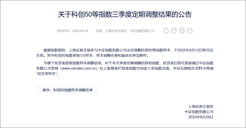寒武纪今日股价重挫与科创50指数即将调整有关,根据上海证券交易所和中证指数公司最新发布的《关于科创50等指数三季度定期调整结果的公告》,上海证券交易所与中证指数有限公司决定调整科创50等指数样本,于2025年9月12日收市后生效。其中科创50指数更换1只样本。