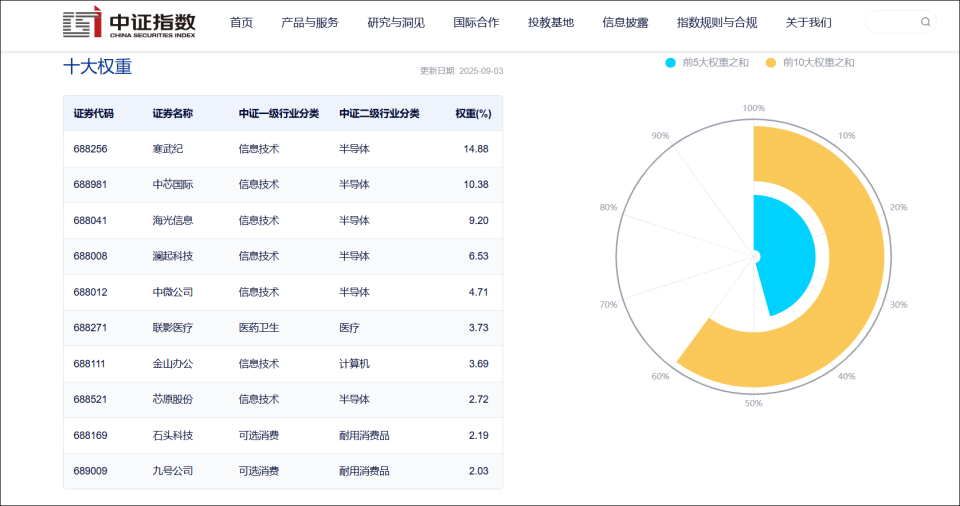 根据中证指数公司最新公布的上证科创板50成份指数十大权重,寒武纪占该指数权重占比接近15%(14.88%),而根据中证指数官网发布的上证科创板50成份指数编制方案,单个样本权重不超过10%,前五大样本权重合计不超过40%,这意味着有接近5%占比的寒武纪权重会在指数调整日前被被动卖出,而这或许正是寒武纪今日股价大跌的直接原因。